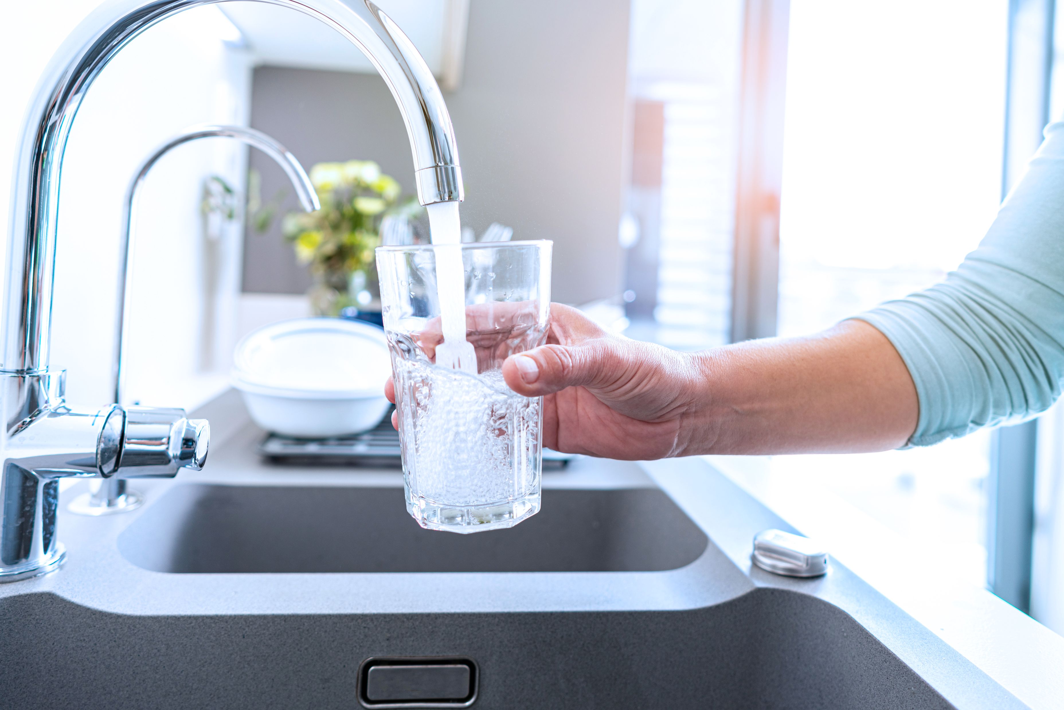 Close up of a woman hand filling a glass of water directly from the tap. High resolution 42Mp indoors digital capture taken with SONY A7rII and Zeiss Batis 25mm F2.0 lens