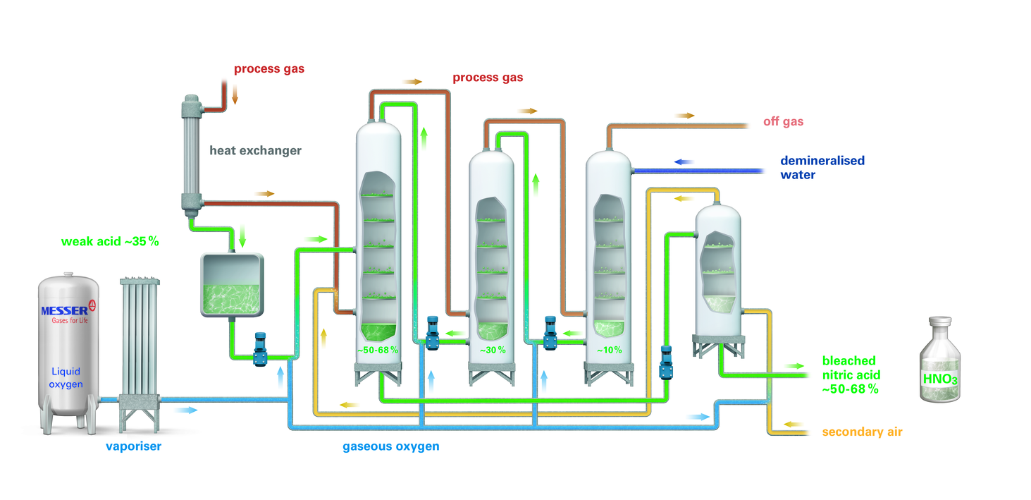 During the absorption process of nitric acid plants, the targeted supply of oxygen to specific points in the process results in a considerable increase in efficiency, resulting in significant savings in raw materials and improvements in environmental protection. Adding oxygen can also increase capacity.